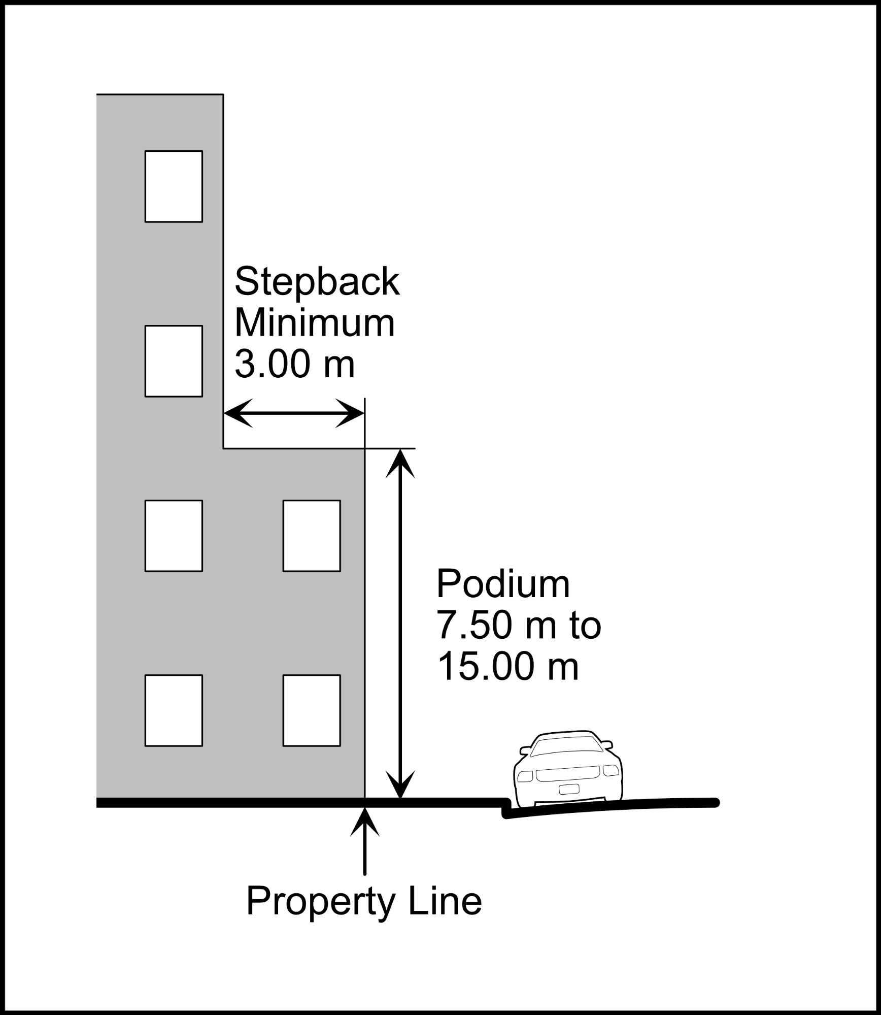 - Provide a minimum front Step-Back means a horizontal recess to a building façade from the vertical façade immediately below it. from the podium of 9.84 ft., as measured from the Building Frontage means a wall or façade on the exterior of a building which faces a public roadway, other than a lane. of the lower Storey means the space between the top of any floor above finished grade, and the top of the next floor above it and, if there is no floor above it, the part between the top of the floor and the ceiling above it. The bottom storey of a building located at street level is commonly referred to as the ground storey. For the purposes of calculating a storey, walkout basements are not included. (Figure 5-10) adjacent to any Public Roadway means a road as defined in section 616 of the MGA and does not include a private roadway or highway..